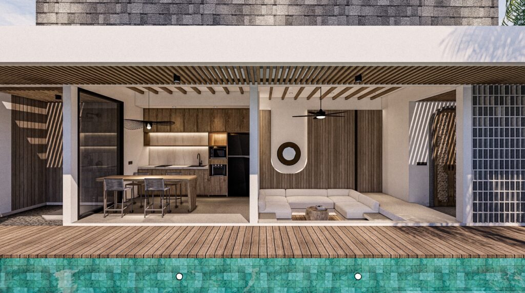 Communal spaces such as the living room, dining area, and kitchen open directly to the pool deck, encouraging interaction and openness.