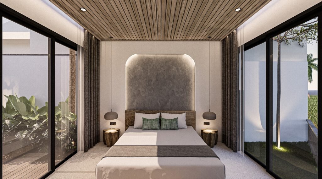 The master bedroom offers a serene retreat with soft lighting, natural materials, and an intimate view toward the private pool — delivering comfort and luxury in perfect balance.